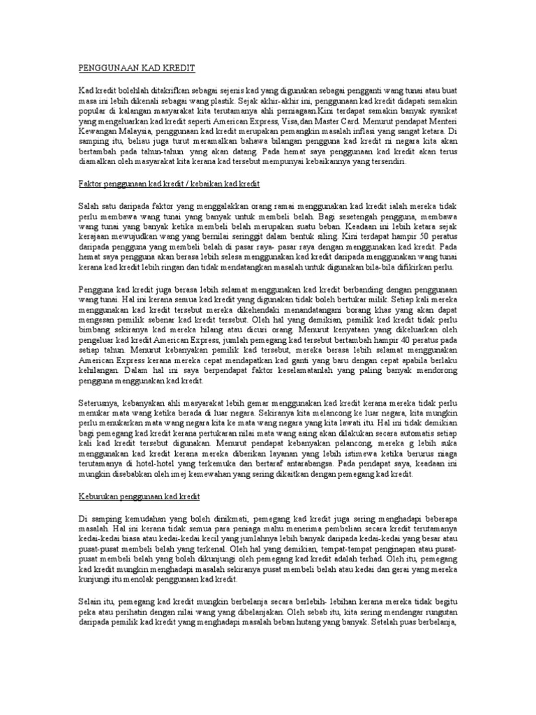 Situasi ini menjadikan pengguna lebih berminat untuk menggunakan kad kredit. Jika tidak digunakan untuk kebaikan, perkara ini mampu merosakkan masa depan dan fikiran remaja itu sendiri. Pintar itu cerdas, dan cerdas itu pintar, bukan begitu ?. Kad big pay ini juga merupakan kad bersifat prepaid. Lagipun, kad kredit mempunyai kelebihan dan kelemahan mereka.