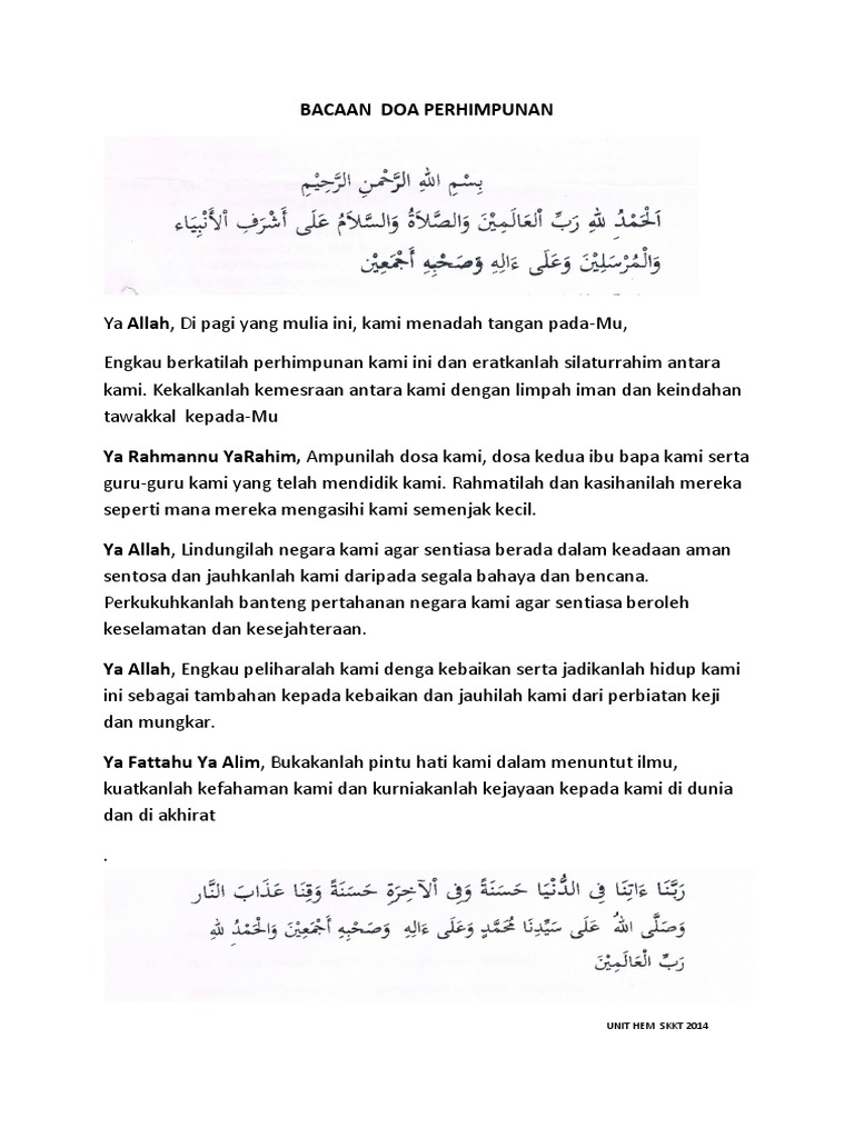 Doa Perhimpunan Bulanan 2 from imgv2-1-f.scribdassets.com Doa semarak kasih, setulus budi_meraikan perpindahan dato' hj yusof bin harun. Doa awal ramadhan dan doa buat ibu ayah. Allahumma, lapangkanlah dada kami bagi menerima pengajaran dan didikan. Sebagai contohnya, bacaan doa bersempena dengan majlis perhimpunan di sekolah. Ya allah, jadikanlah perhimpunan kami ini sebagai perhimpunan yang diberkati dan dirahmati. Daripada abu barzah r.a berkata, hadis yang bermaksud: Ini adalah doa yang anda boleh baca untuk membantu anak anak anda yang sedang belajar dan akan menghadapi peperiksaan. Ampunkanlah dosa kami, dosa kedua ibu bapa kami, dosa guruguru kami dan seluruh umat islam, lengkapkanlah budi pekerti kami