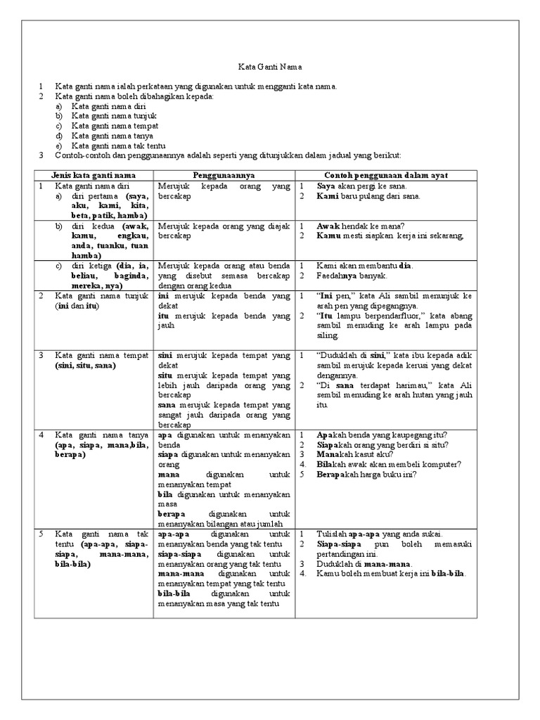 Contoh kata ganti tempat dan penggunaannya adalah seperti 2. Kami selalu datang ke rumahmu setiap tahun. Kata ganti nama tunjuk ialah perkataan yang menjadi pengganti pada kata nama dan mendukung maksud menunjukkan benda atau perkara yang dirujukkan itu. Kata ganti nama tunjuk2i 3skata ganti nama tunjukdigunakan untuk menunjukkan:bendamanusiahaiwantempat. Kata nama khas terbahagi kepada dua kumpulan, iaitu nama khas hidup dan kata nama khas tak hidup. Contoh kata ganti nama diri singkat. Ini kereta baru abang saya. Kata ganti nama tunjukkata ganti nama tunjukinimenunjukkan sesuatu yang dekatitumenunjukkan sesuatu yang jauh. Digunakan untuk menunjukkan sesuatu benda, tempat, manusia dan binatang. Berikan buku ini kepada !atimah. Menyatakan tempat yang agak jauh tetapi dapat dilihat. Kata ganti dan kata tunjuk. Maka dengan menggunakan kata ganti, tentunya membuat kita tidak harus menuliskan lagi nama orang atau benda secara.