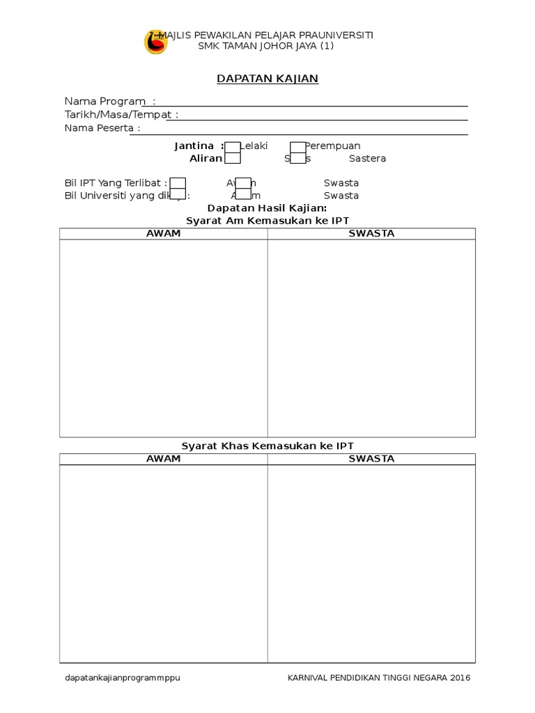 Karnival Pendidikan Tinggi Negara 2016 Social Media from events.utm.my Bagi anda yang ingin membuat permohonan untuk makluman tujuan utama karnival pendidikan tinggi ini diadakan adalah memberi peluang kepada orang awam untuk mendapatkan. .maklumat mengenai peluang pendidikan tinggi yang ditawarkan oleh universiti awam (ua), politeknik, kolej komuniti, institusi latihan kemahiran awam (ilka), ipts dan institusi lain kepada pengunjung karnival yang terdiri daripada pelajar sekolah, guru, ibu bapa serta masyarakat setempat. Karnival kptn bakal memasuki edisi ke 16 tahun ini dan akan diadakan di beberapa negeri dan zon di seluruh malaysia yang dijangkakan bermula dari pertengahan februari 2020 hingga minggu akhir bulan mac 2020. Karnival pendidikan tinggi negara yang juga dikenali sebagai kanival jom masuk ipt ini memberi peluang kepada anda untuk melanjutkan pengajian menerusi pameran lokasi dan tarikh karnival pendidikan tinggi negara 2018. Tarikh dan lokasi karnival pendidikan tinggi negara 2020|adakah anda berminat menyambung pengajian di universiti awam (ua)? Jabatan pengajian tinggi sedang giat menganjurkan karnival pendidikan tinggi negara jom masuk u di seluruh negara. Kedua, pendidikan kewargenaegaraan di perguruan tinggi misi pendidikan sebagai kepribadian, pemahaman tentang hubungan warga dengan terminologi kewarganegaraan. Pendidikan kewarganegaraan untuk perguruan tinggi.