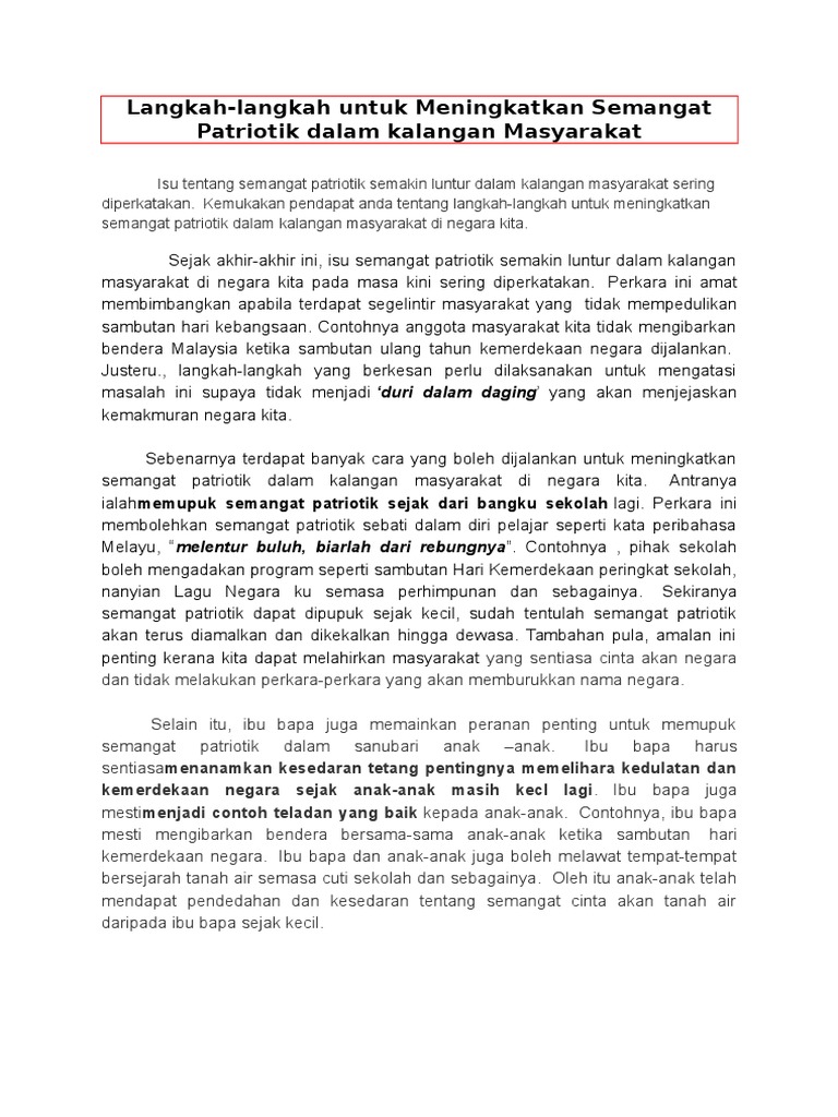 Langkah Langkah Pelbagai Pihak Untuk Meningkatkan Semangat Patriotik Dalam Kalangan Remaja Karangan Panjang Spm Miss Woodley from 2.gravatar.com Semangat ini mampu mempengaruhi masyarakat untuk mengutamakan kepentingan negara berbanding dengan kepentingan diri. Contohnya , pihak sekolah boleh mengadakan program seperti sambutan hari kemerdekaan peringkat sekolah, nanyian lagu negara ku semasa perhimpunan dan sebagainya. Cara cara menunjukkan semangat patriotik. Hal ini demikian kerana tentatif program tersebut dipenuhi dengan aktiviti memupuk semangat patriotik seperti latihan kawat kaki, kursus menembak, dan aktiviti berkumpulan. Semangat patriotisme merujuk kepada perasaan cinta akan negara yang mendalam dalam diri seseorang. Sebenarnya terdapat banyak cara yang boleh dijalankan untuk meningkatkan semangat patriotik dalam kalangan masyarakat di negara kita. Perkara ini membolehkan semangat patriotik sebati dalam diri pelajar seperti kata peribahasa melayu, melentur buluh, biarlah dari rebungnya. Menganjurkan kem jati diri yang mana pengisiannya mestilah bertumpu kepada usaha memberikan kesedaran kepada golongan remaja.
